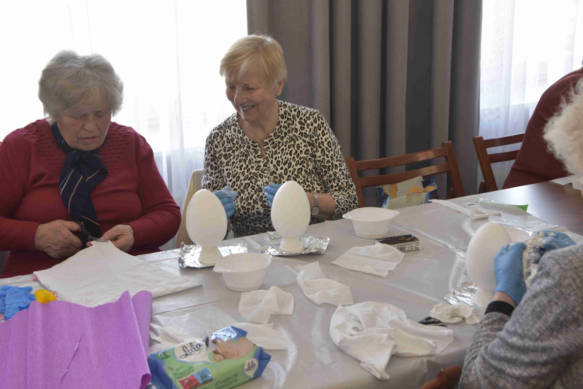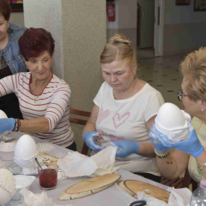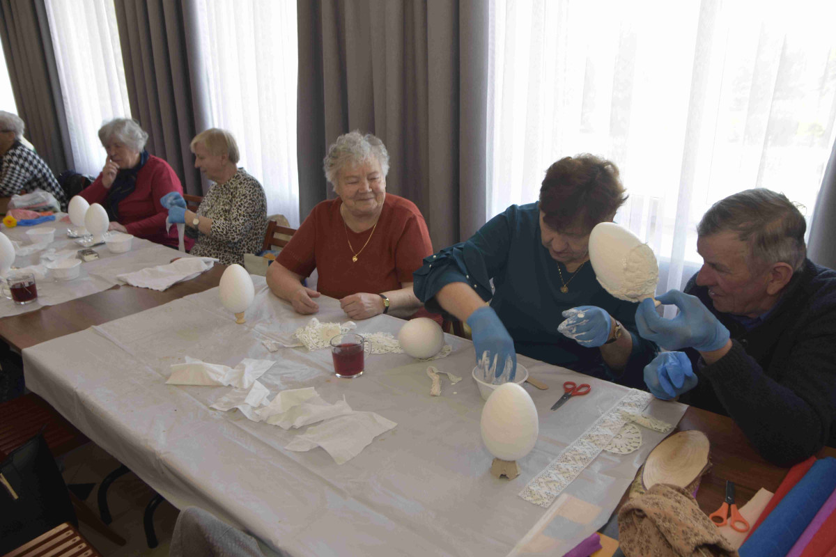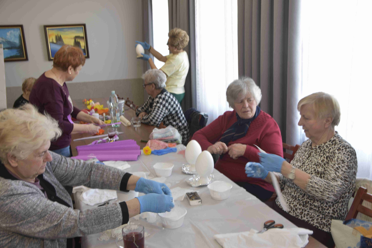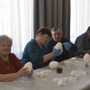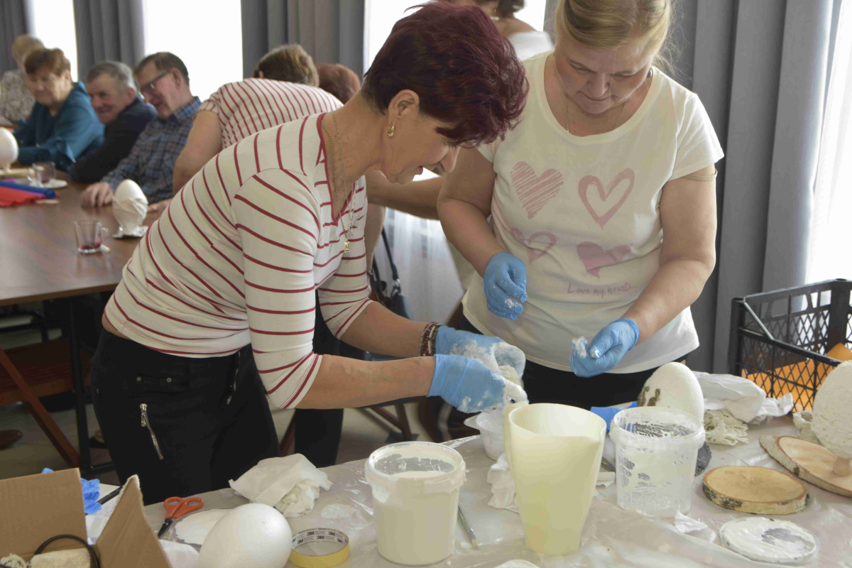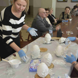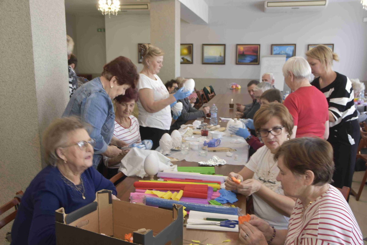Kolejne spotkanie Seniorów z gminy Kąkolewnica odbyło się w Gminnym Ośrodku Kultury w Kąkolewnicy w dniu 19 marca br., część z uczestników wykonywało kwiatki i ozdoby które będą wykorzystane przy wiciu palm wielkanocnych - które odbędzie się 26 marca, kolejna grupa zajmowała się ozdabianiem wielkich steropianowych jaj wielkanocnych przy użyciu techniki utwardzania tekstylnego. Jak zwykle była przerwa na gimnastykę dla wszystkich, aerobik i pyszny poczęstunek z wielkanocnej kuchni.