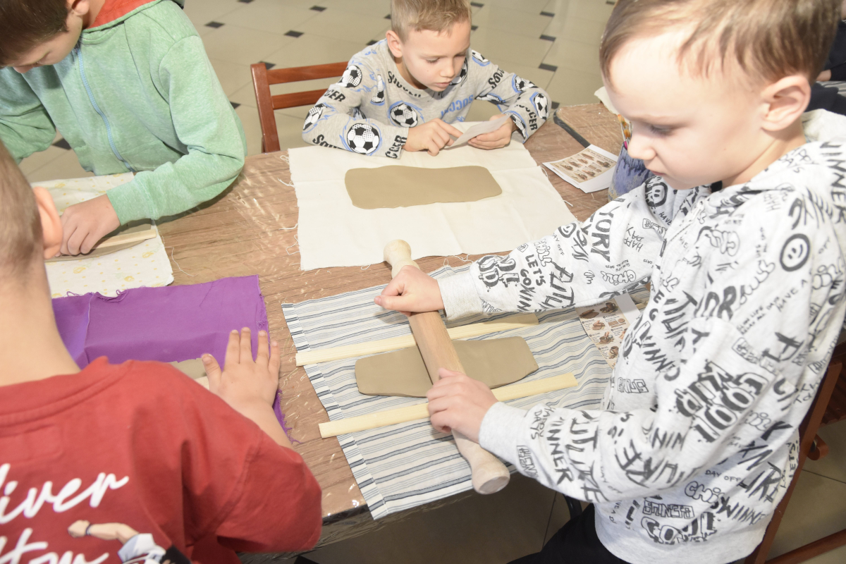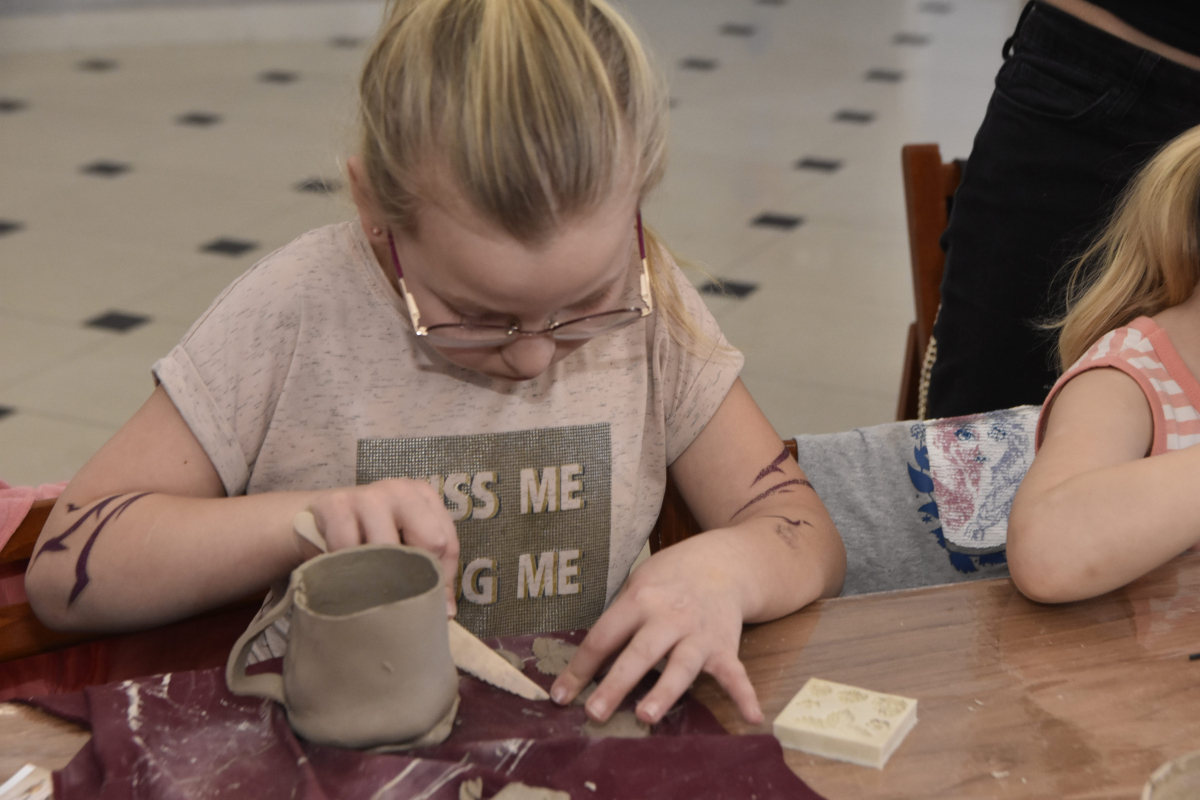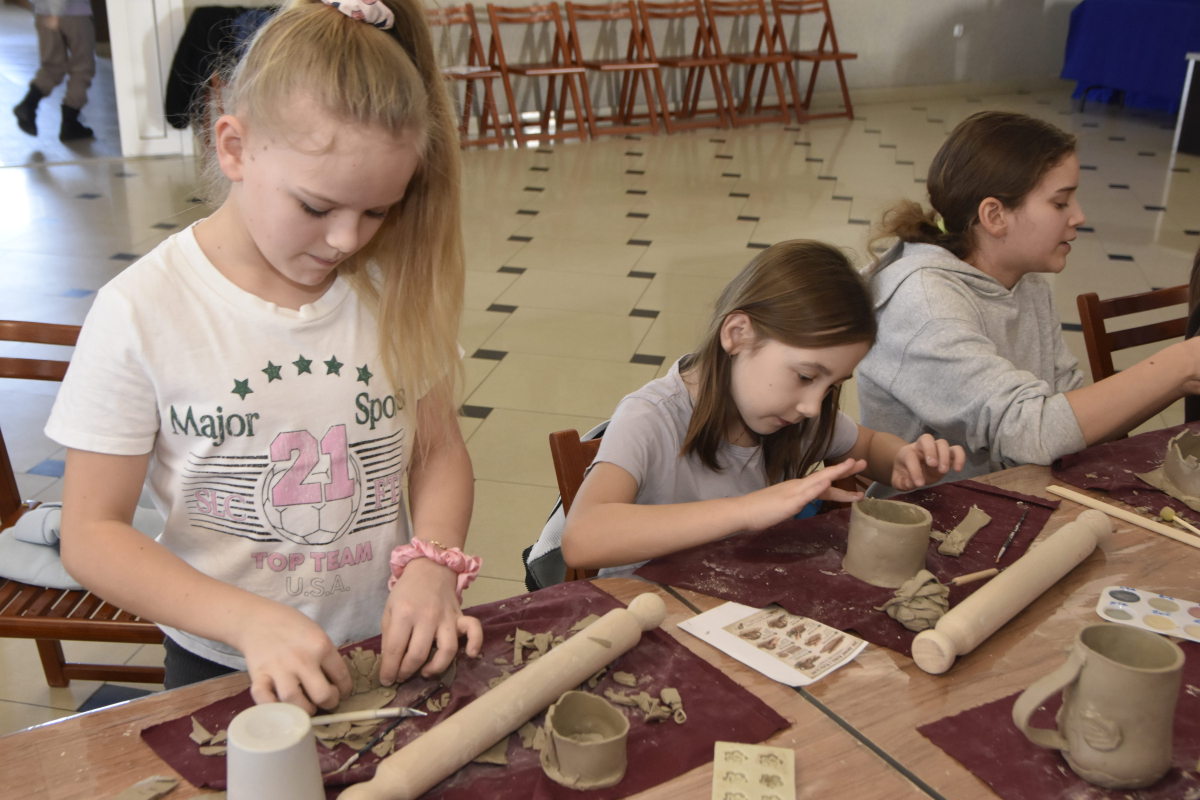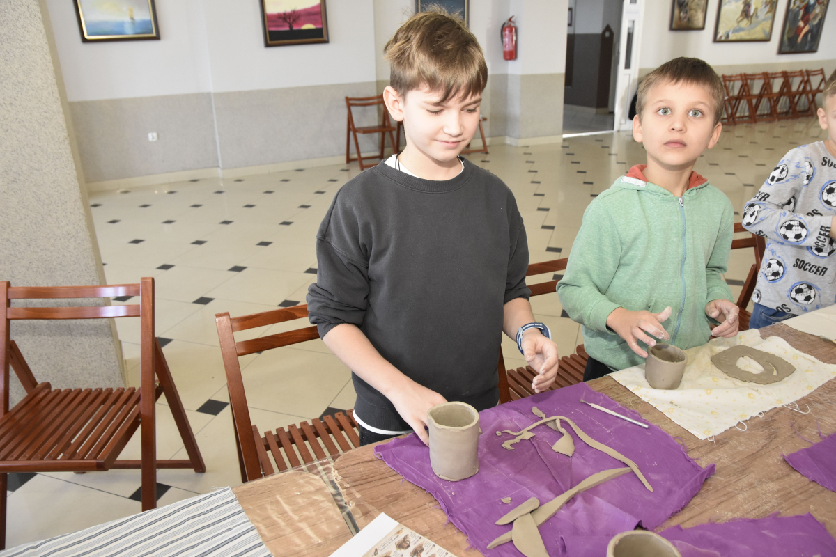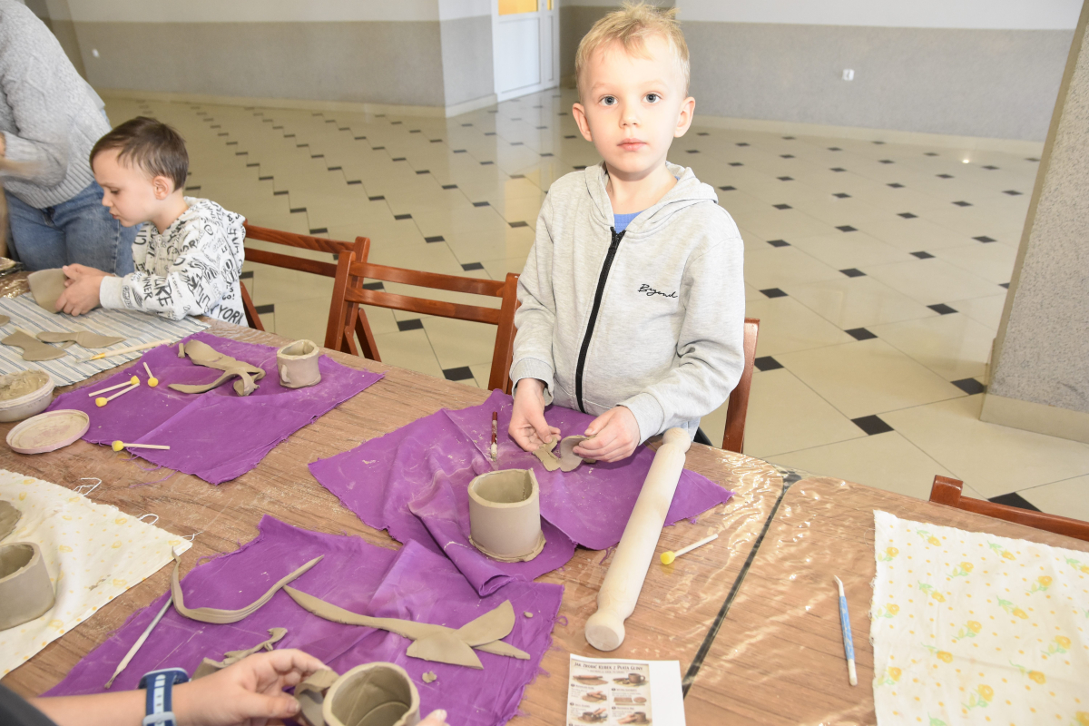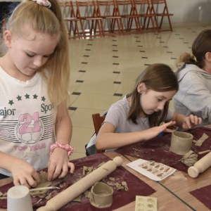 Podczas zajęć młodzi uczestnicy zajęć własnoręcznie wykonywali naczynia z gliny przy pomocy instruktorki.