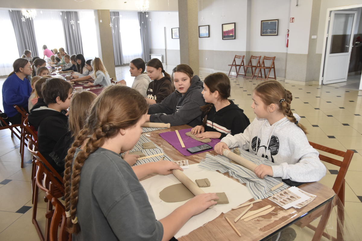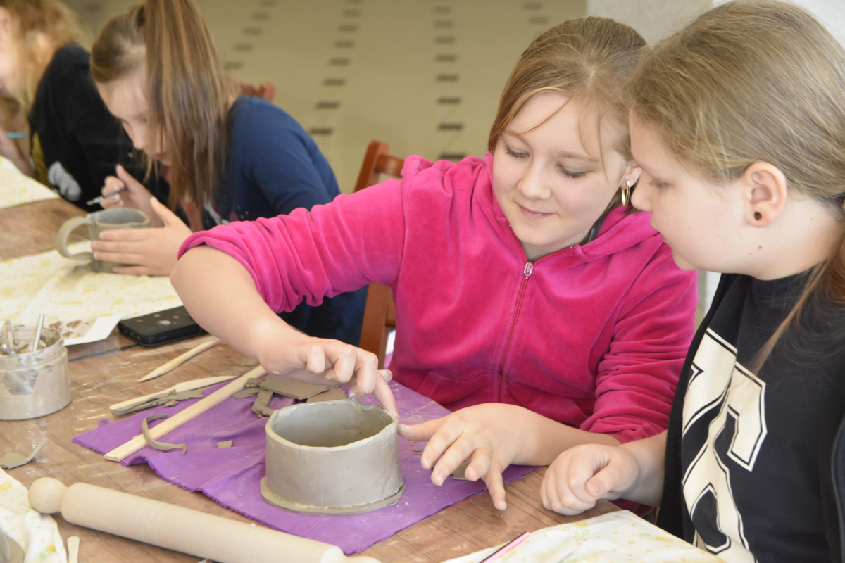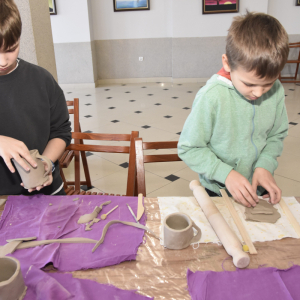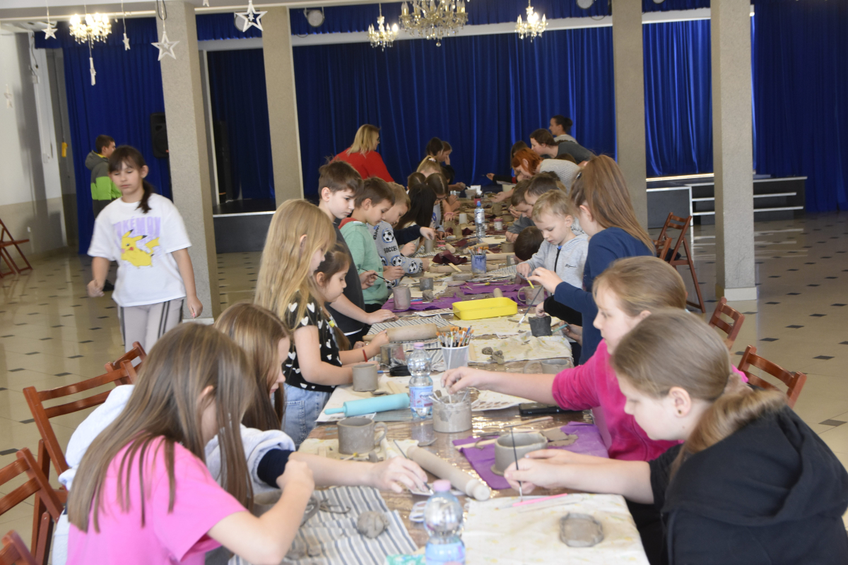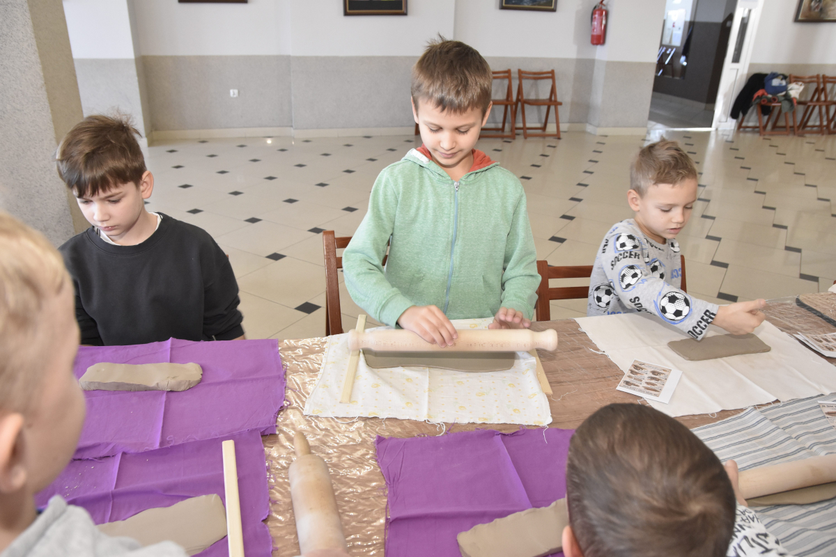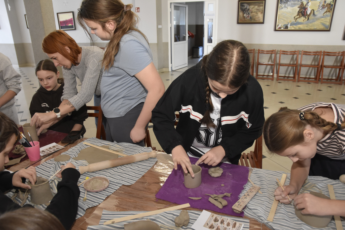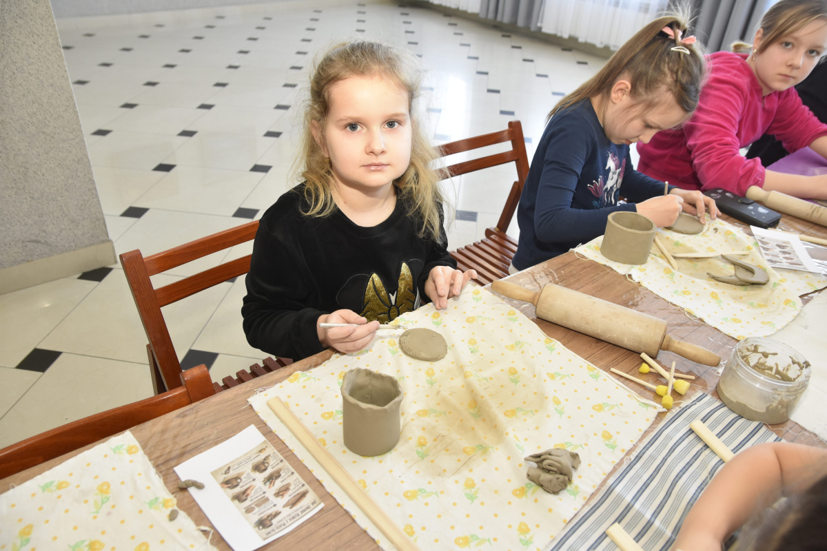 Podczas zajęć młodzi uczestnicy zajęć własnoręcznie wykonywali naczynia z gliny przy pomocy instruktorki.