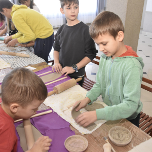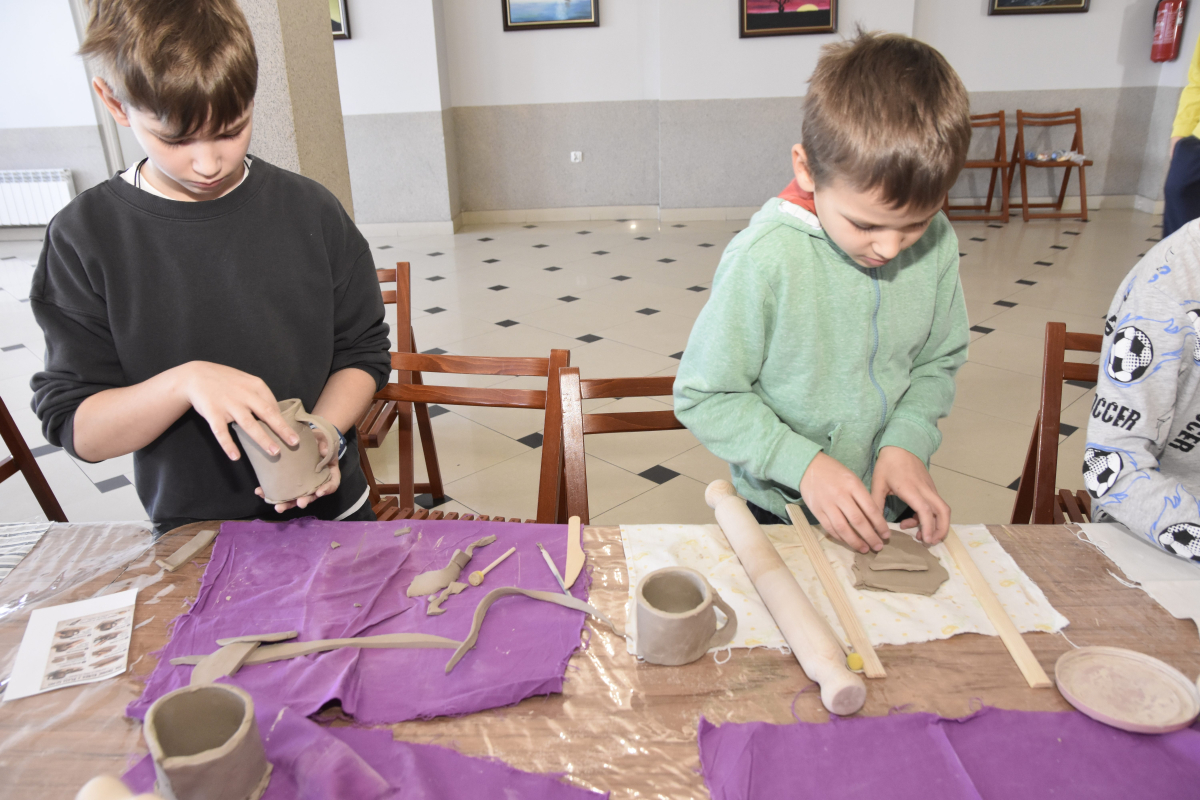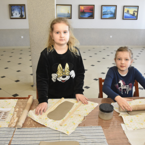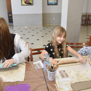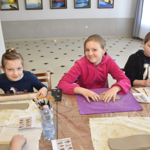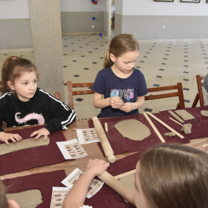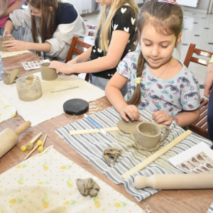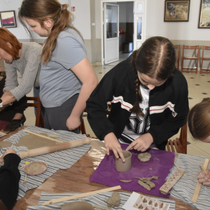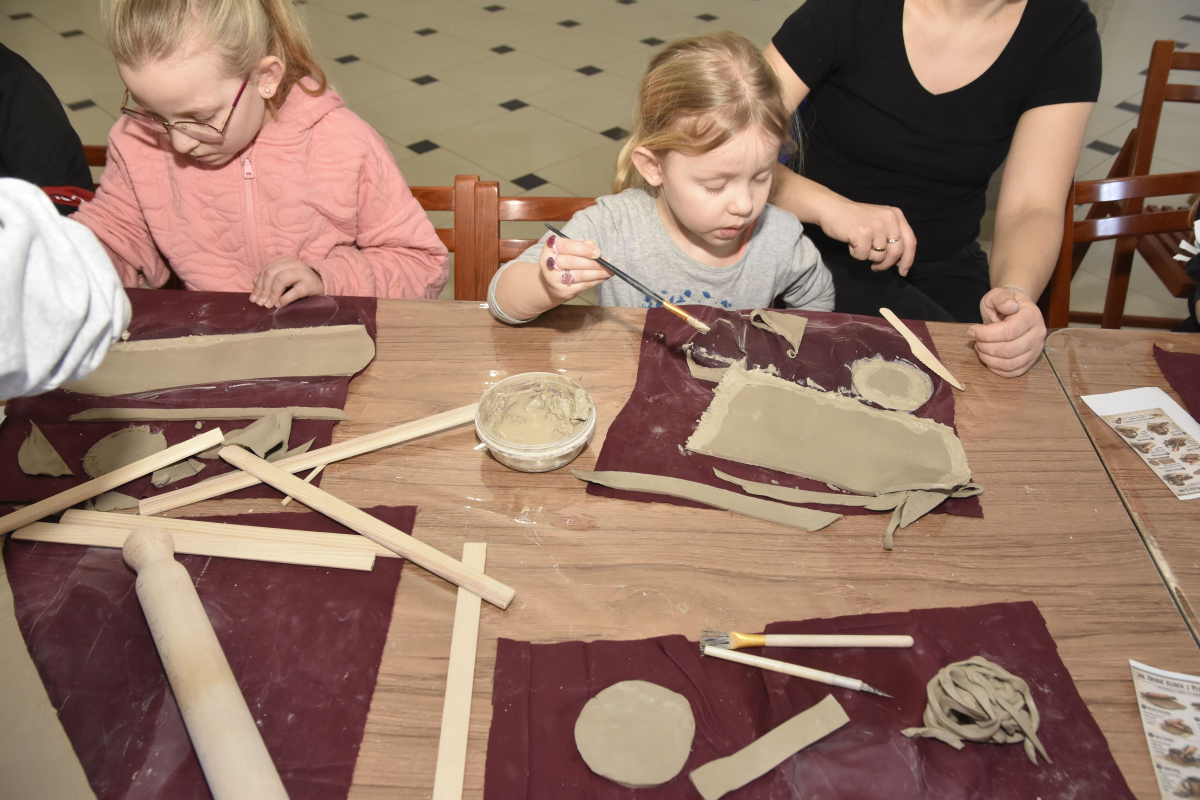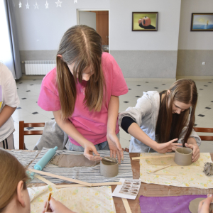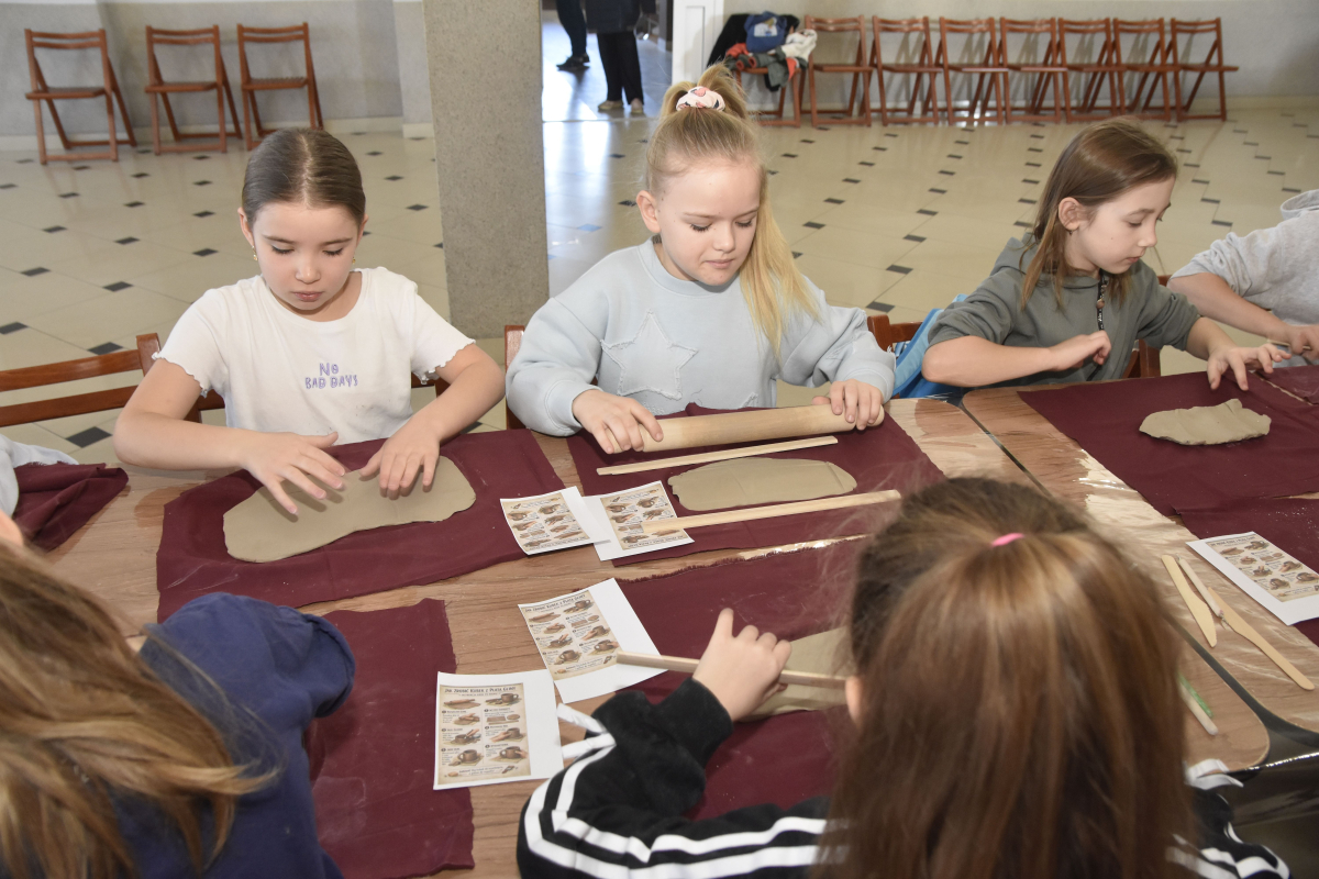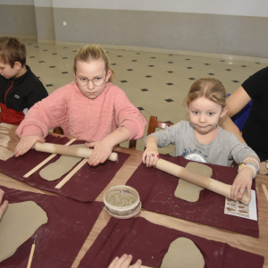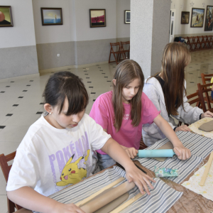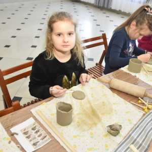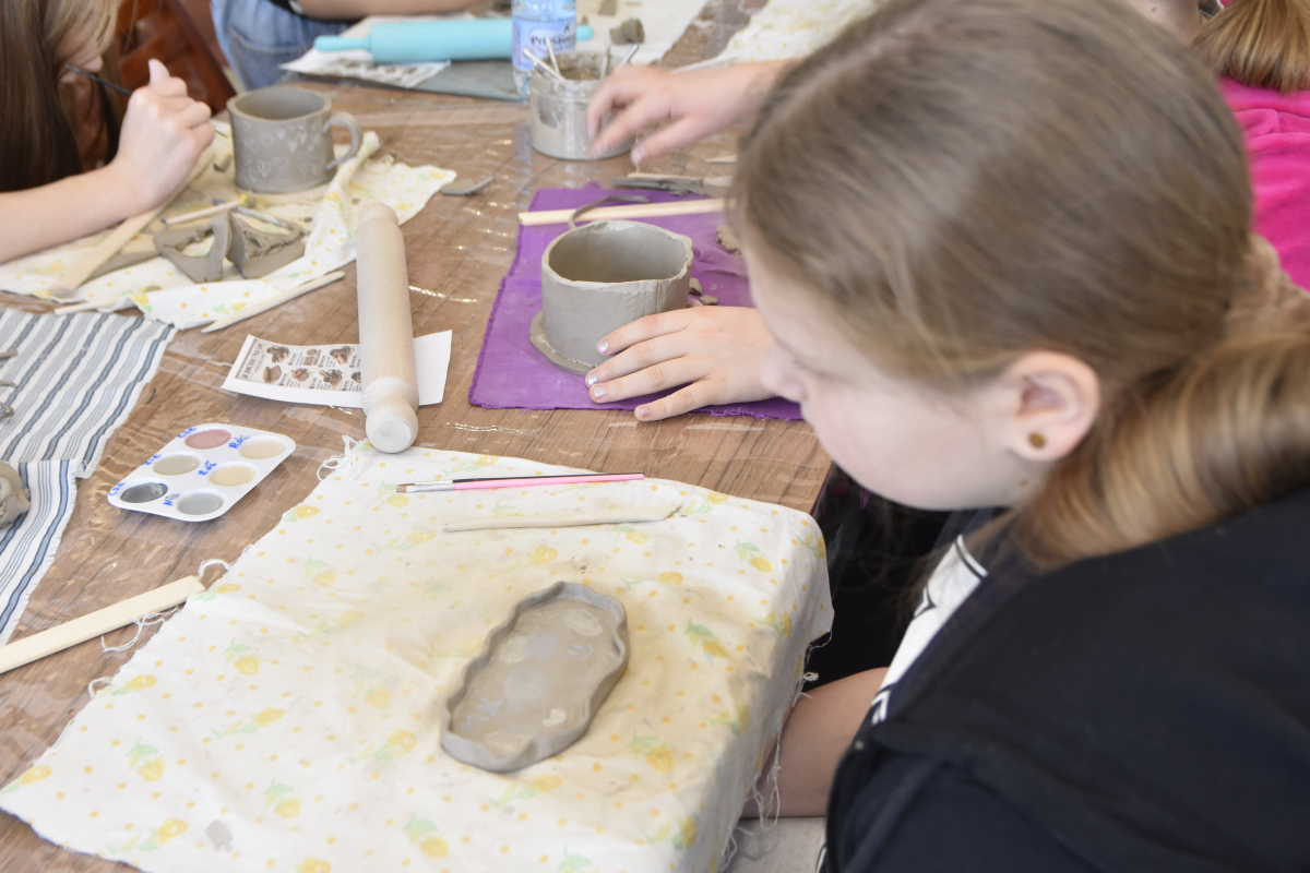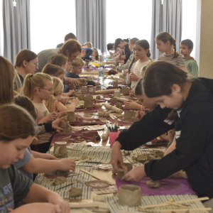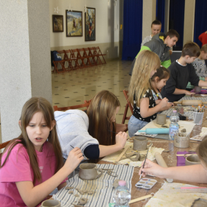 Podczas zajęć młodzi uczestnicy zajęć własnoręcznie wykonywali naczynia z gliny przy pomocy instruktorki.